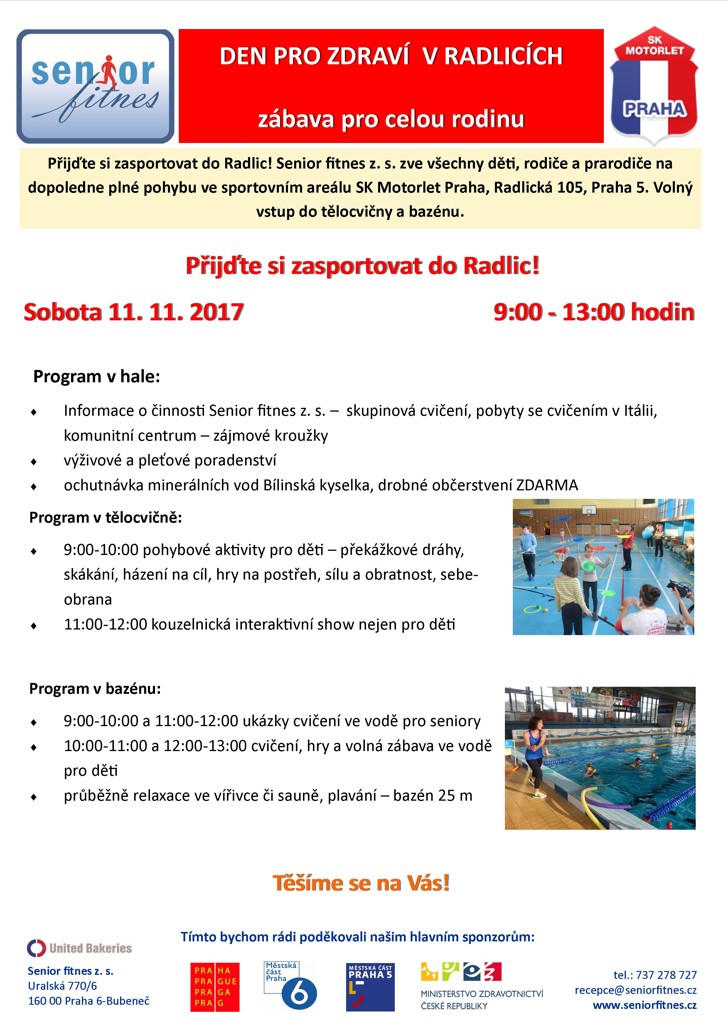 « Všechny Akce akce již proběhla. Den pro zdraví 11.11.2017 11.11.2017 @ 9:00 - 13:00 « Druhé setkání projektových partnerů v Praze Seminář cvičitelů – 19.1.2018 » Praha – Radlice Fotografie z akce + Kalendář Google+ Exportovat iCal Podrobnosti Datum: 11.11.2017 Čas: 9:00 - 13:00 Rubrika Akce: Den pro zdraví Štítky Akce:sport Pořadatel SENIOR FITNES z.s. Telefon: +420 737 278 727 Email: seniorfitnes@seznam.cz Webová stránka: www.seniorfitnes.cz Místo konání Bazén Radlice Radlická 298/105 Praha 5 - Radlice, Praha 150 00 Česká republika + Google Mapa Webová stránka: http://www.sk-motorlet.cz/